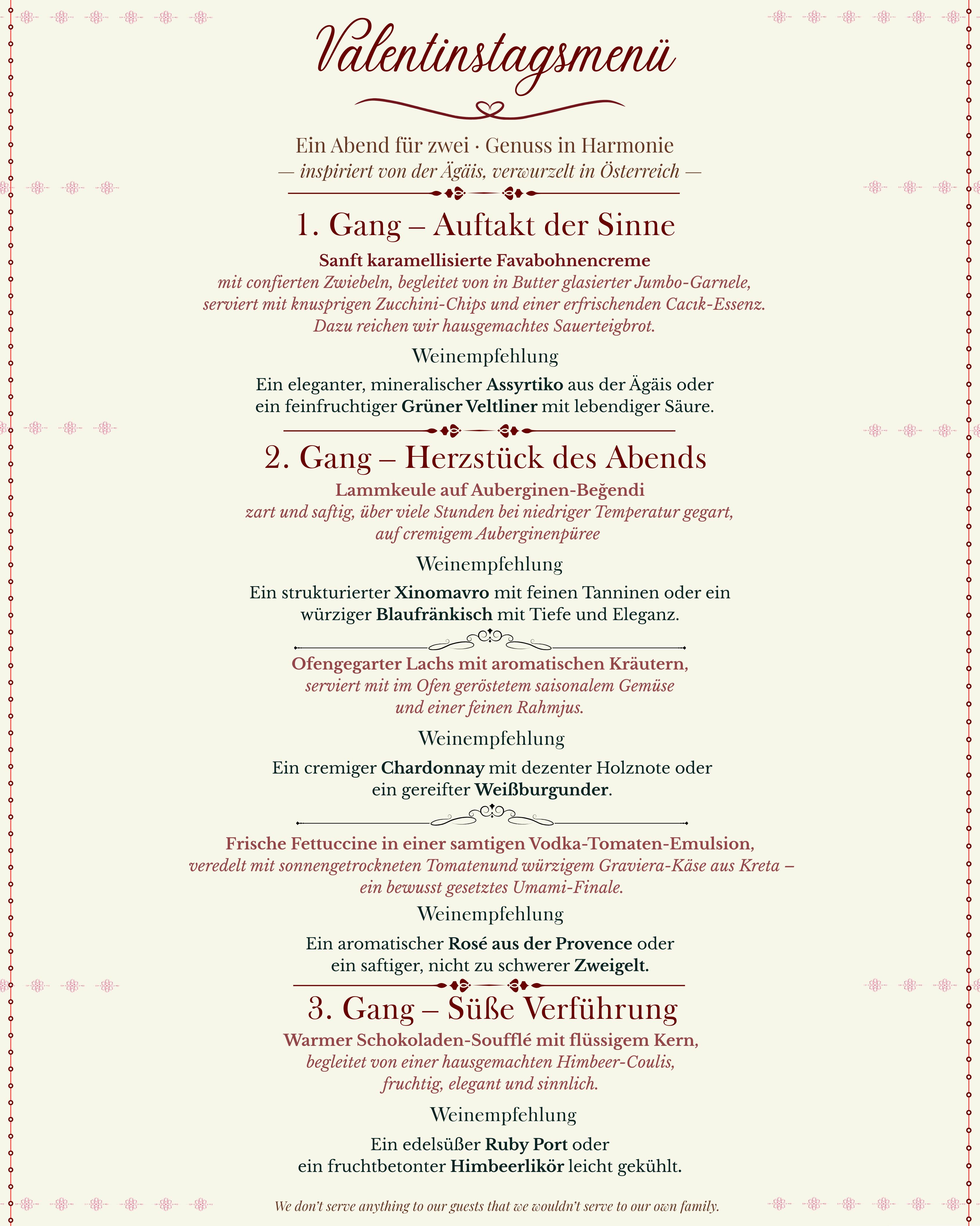 Ein Abend für zwei. Kerzenlicht auf den Tischen, echte griechische Live-Musik in der Luft und ein mit viel Liebe zusammengestelltes Valentinstagsmenü – inspiriert von der Ägäis.